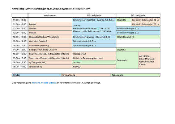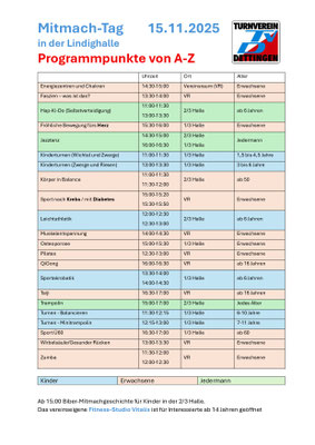 Der Turnverein 01 Dettingen e.V. bietet ein breites Spektrum an Sport- und Unterhaltungsangeboten für jedes Alter in den folgenden Bereichen: